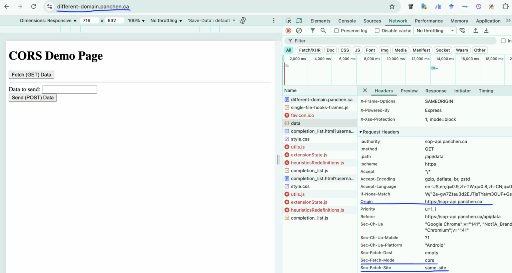 In short, without the backend configuring CORS (i.e., specifying which domains are allowed to make requests), JavaScript running on an untrusted domain cannot perform CRUD operations on the backend. Since the request headers are constructed by the frontend, the browser is actually protecting the user — this is one of the built-in security features of modern browsers.